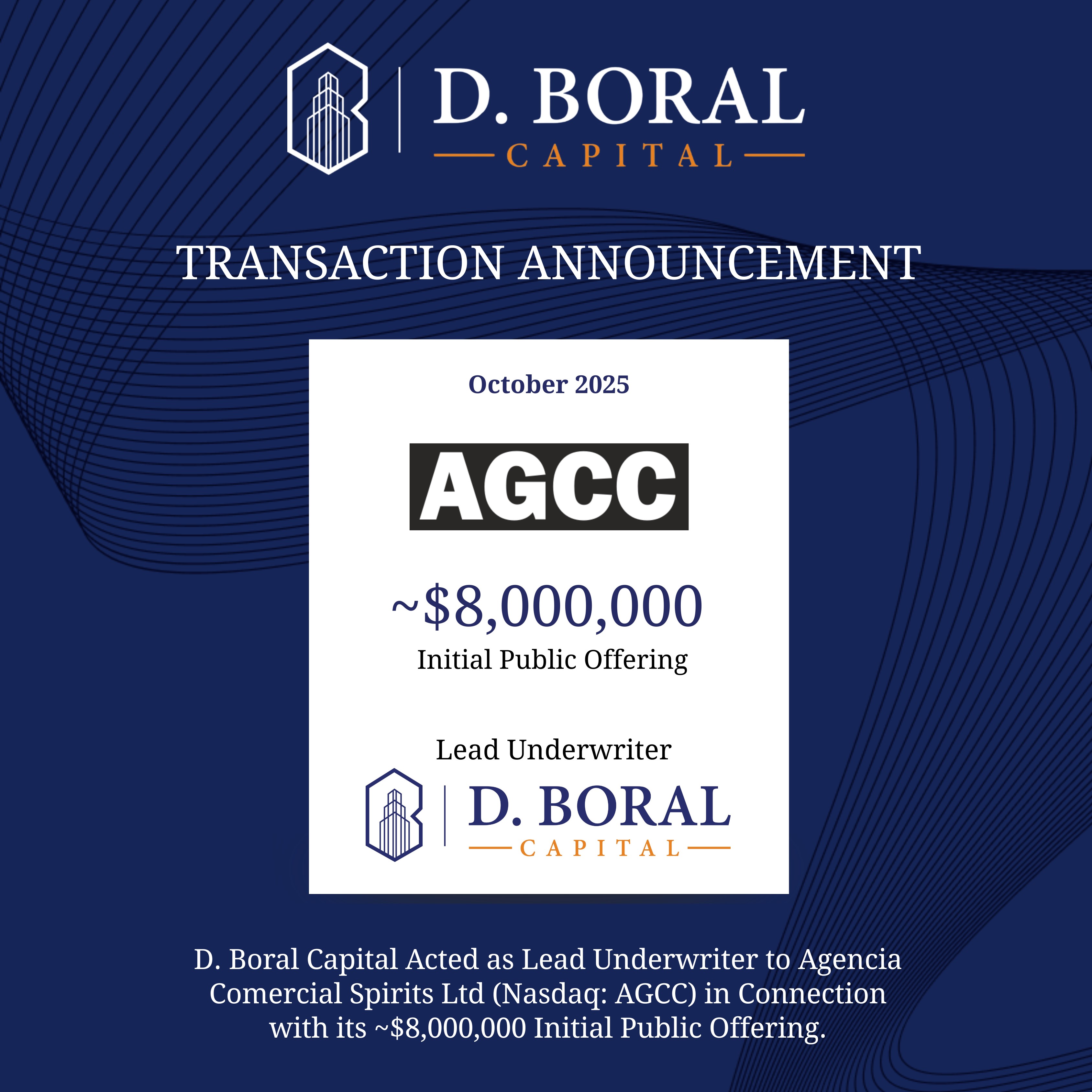 D. Boral Capital Acted as Lead Underwriter to Agencia Comercial Spirits Ltd. (Nasdaq: AGCC) in Connection with its ~$8,000,000 Initial Public Offering