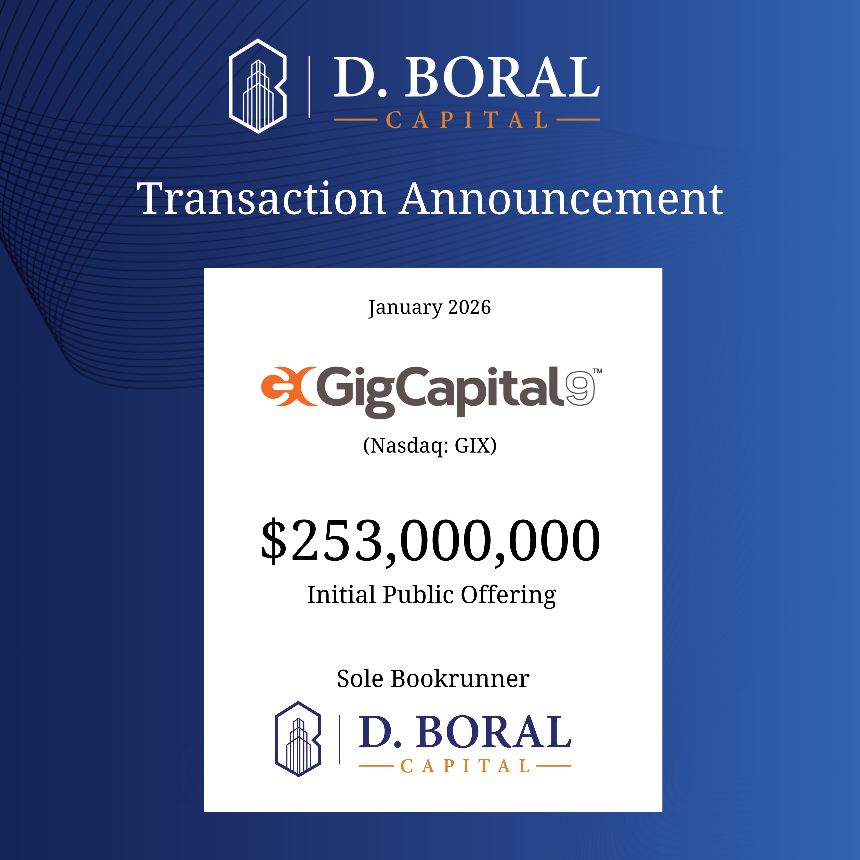D. Boral Capital Acted as Sole Bookrunner to GigCapital9 Corp. (Nasdaq: GIX) in Connection with its $253,000,000 Initial Public Offering