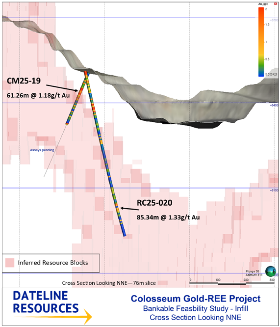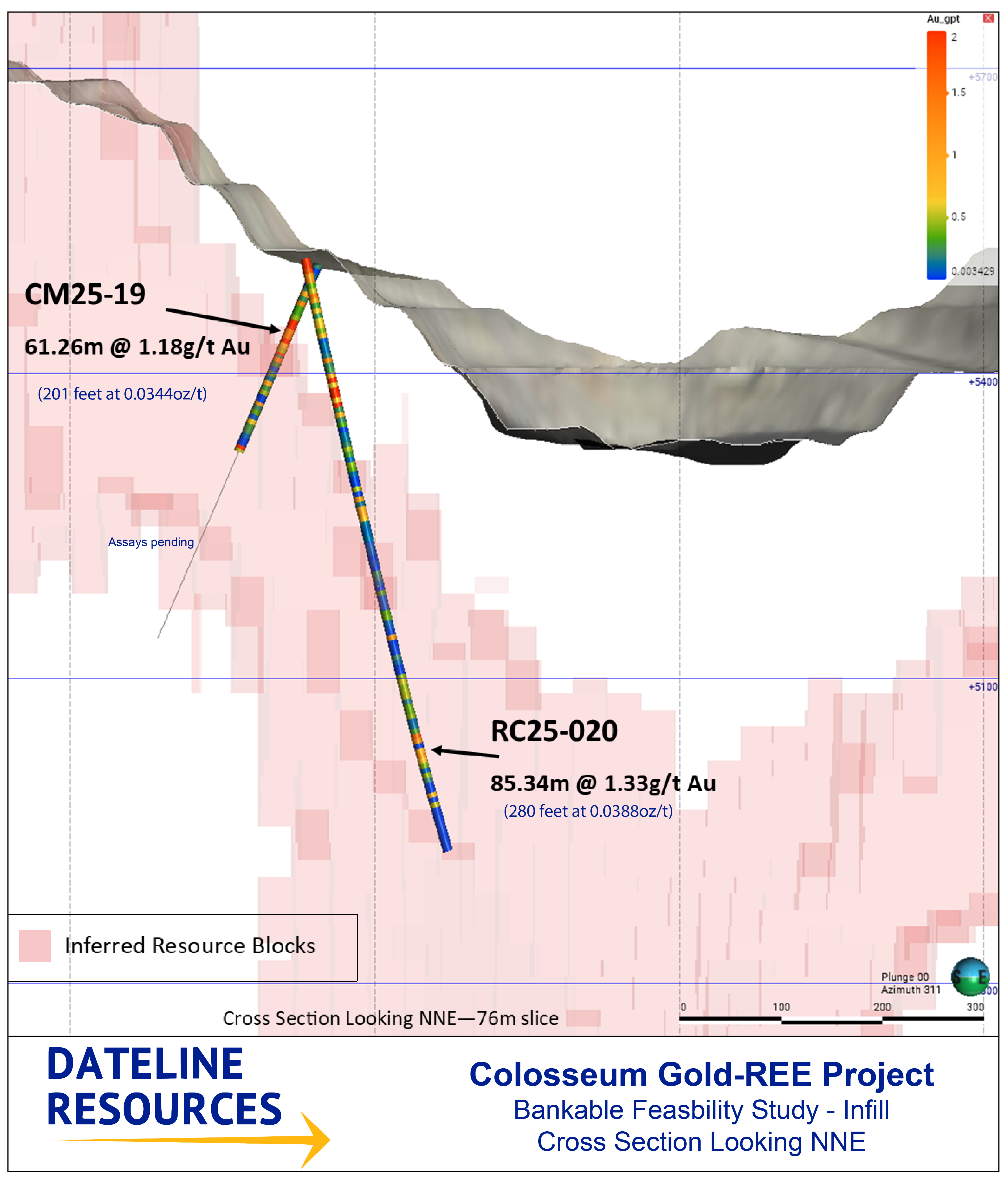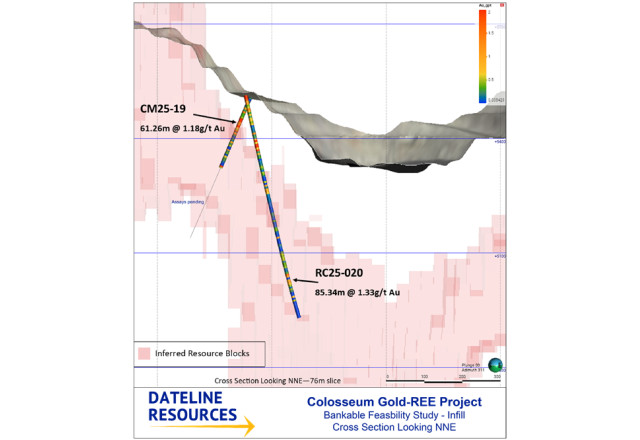 SAN BERNARDINO, Calif., November 18, 2025 (Newswire.com) - Dateline Resources Limited (ASX:DTR)(OTCQB:DTREF)(FSE:YE1) is pleased to announce that recent drilling at its 100%-owned Colosseum Gold and Rare Earth Element (REE) Project in San Bernardino County, California has returned encouraging gold assay results that align with the Company's expectations and confirm the continuity of mineralisation within the existing open-pit mineral resource. These results strongly support the Company's strategy to convert Inferred Mineral Resources to the higher confidence Measured and Indicated categories, thereby upgrading the JORC-2012 mineral resource as part of the ongoing feasibility work.