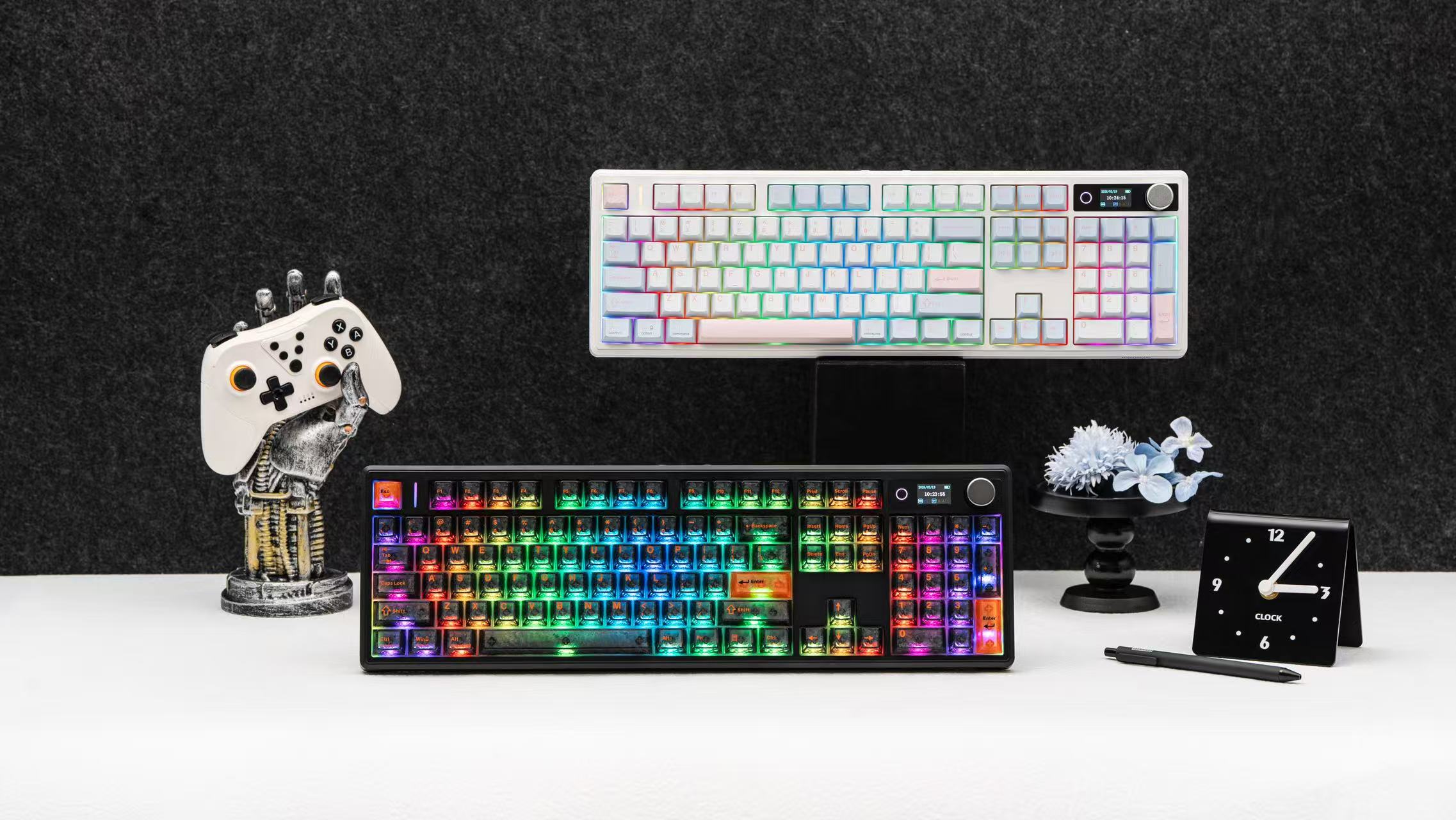 The noticeable visual updates of this keyboard are the side ambient lighting and the placement of the knob. The side ambient lights match the textured patterns, creating a beautiful and stylish look. The control knob has been moved from the side to the front, placing it within natural reach and making operations more direct. Together, these changes give the keyboard a fresher appearance while improving everyday usability.