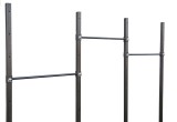 Constructed of 2 ½" structural grade square steel tube and 3" channel, the Base Unit frame rises from 8' to 8-1/2' for varying height pull up stations, accommodating athletes of all size. It is 14' wide and 6' deep and can be installed either against a wall or off set to allow for training access from all sided. The frame posts come pre-drilled with holes for optional rack brackets and expansion kits are available in 6' and 4' sections to make larger units for more expansive spaces.