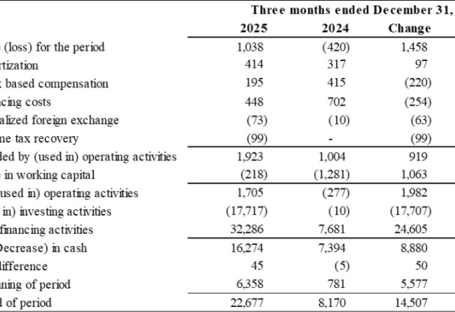 The Company generated positive cash from operations of $1.9 million for Q1 2026, compared to cash generated from operations of $1.0 million in Q1 2025. Cash generated from operating activities before net changes in working capital was $1.7 million for FY2025 compared to cash used of $(0.3) million for Q1 2025. A significant improvement in operating cash flow of $2.0 million.