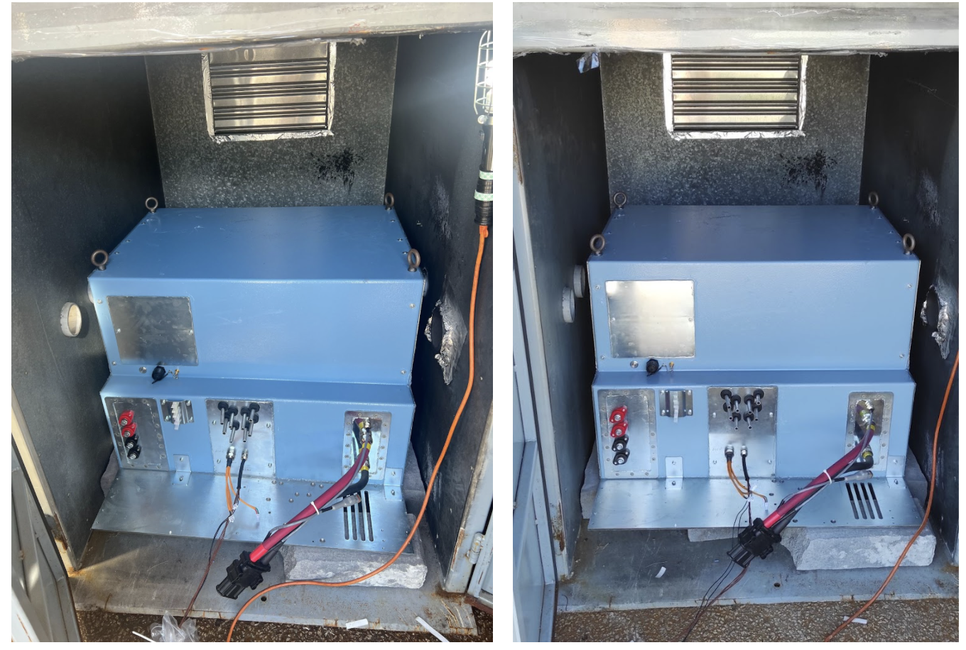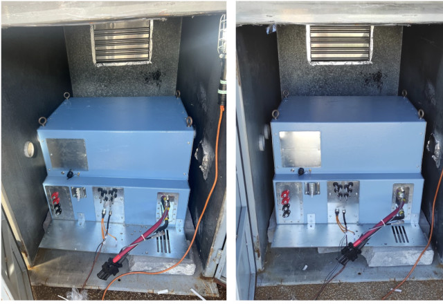 Image of the Electrovaya high voltage battery before (L) and after the fire propagation testing ®
