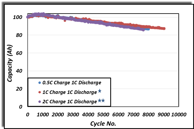 - Capacity Retention: Following more than three years of continuous testing, cells have completed more than 9,000 cycles with approximately 87% capacity retention. Testing has been completed at a variety of temperatures and charge/discharge rates.