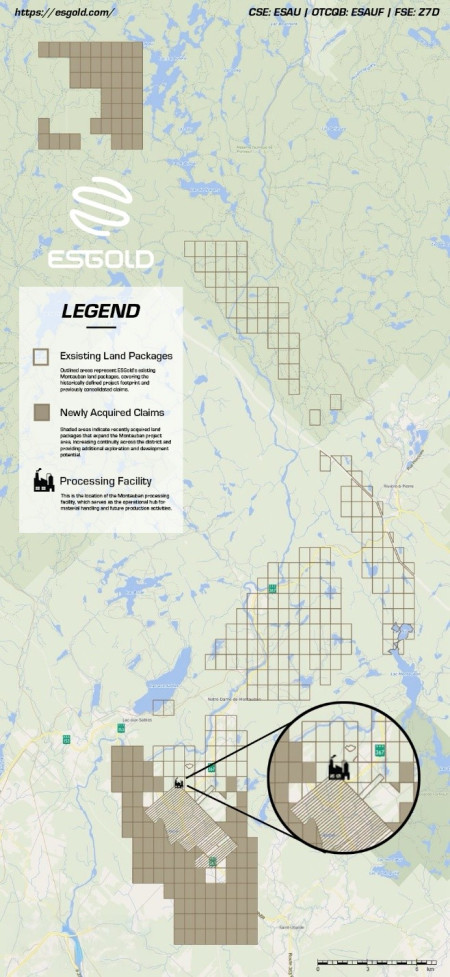 With these newly staked claims, ESGold now controls 417 mining claims covering approximately 20,618 hectares or 206 square kilometres around its Montauban project, representing the largest contiguous mineral tenure held by a single company in the Montauban region. Most of the newly acquired claims are open ground and are strategically located adjacent to the Company's core Montauban property.