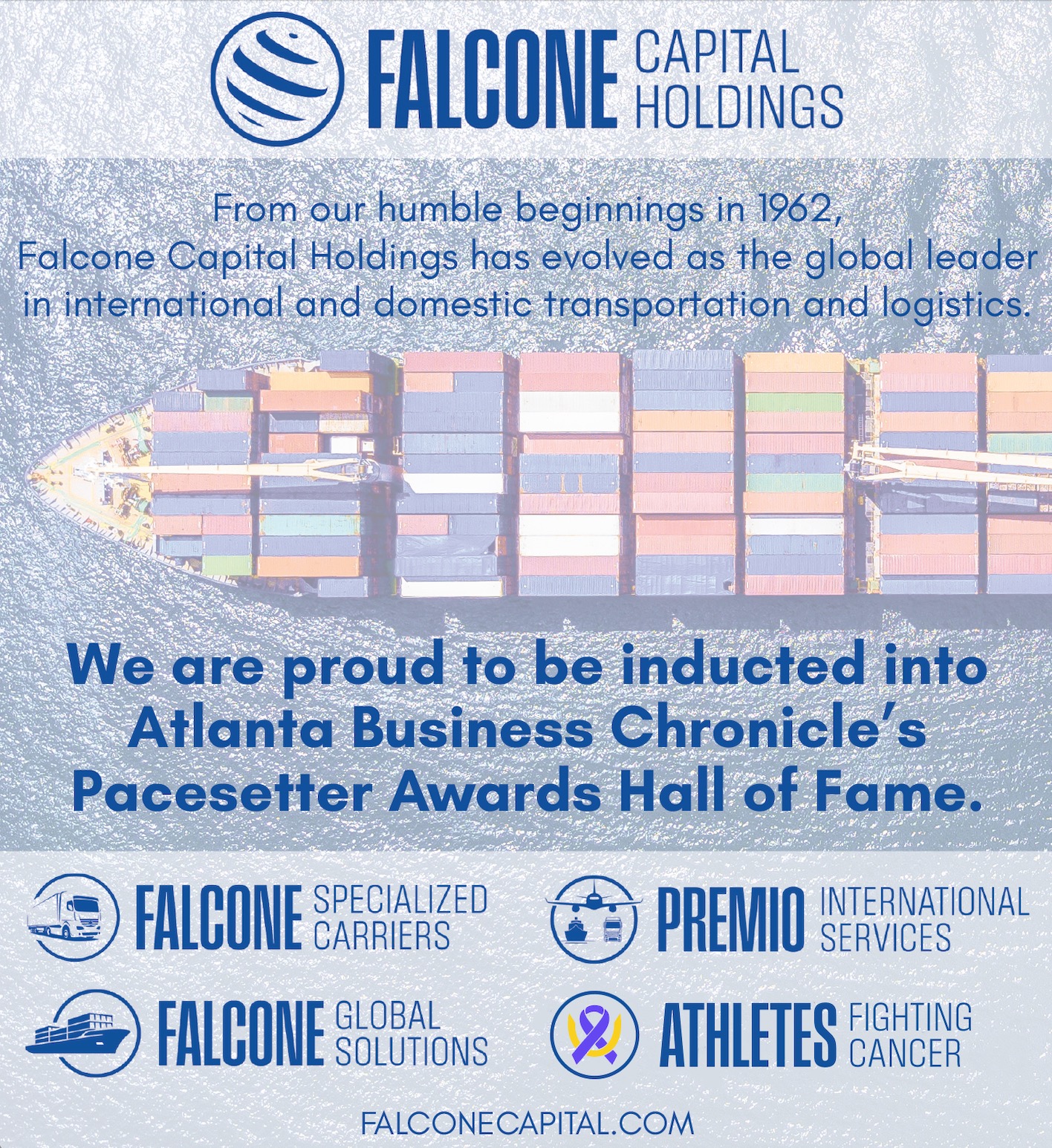 Falcone Capital Holdings' inclusion in the Atlanta Business Chronicle's Pacesetter Hall of Fame underscores its successes and future as a proven leader in the international and domestic logistics space.