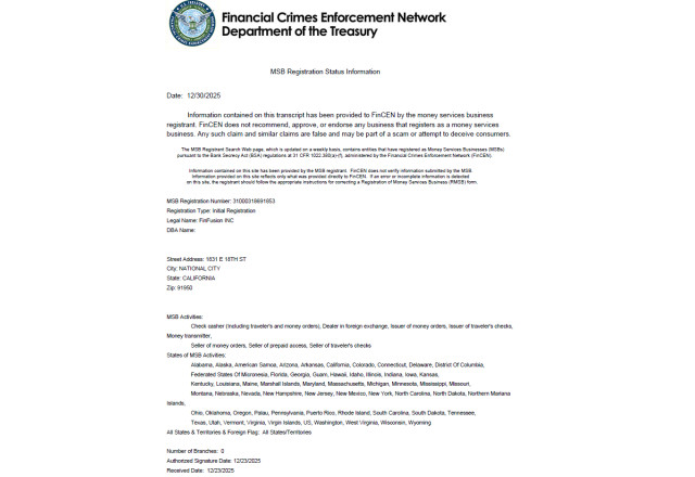In parallel with corporate disclosure arrangements, FinFusion Exchange's U.S. operating entity has completed registration as a Money Services Business (MSB) under the framework of the Financial Crimes Enforcement Network (FinCEN), a bureau of the U.S. Department of the Treasury.