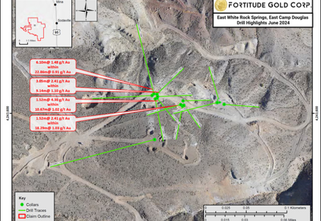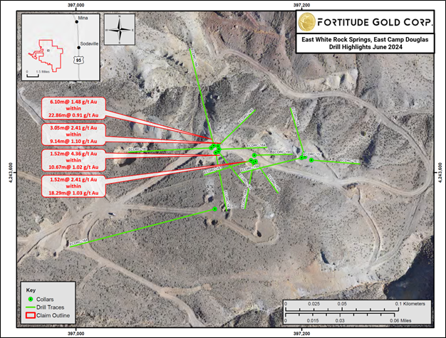 COLORADO SPRINGS, CO, June 4, 2024 (Newswire.com) - Fortitude Gold Corp. (OTCQB:FTCO) (the "Company") announced continued multiple wide, high-grade oxide gold drill intercepts from its East White Rock Springs target located on the northern portion of the East Camp Douglas property. Intercepts include 1.52 meters grading 2.41 grams per tonne (g/t) gold within 18.29 meters grading 1.03 g/t gold, 1.52 meters grading 4.36 g/t gold within 10.67 meters grading 1.02 g/t gold, and 6.10 meters grading 1.48 g/t gold within 22.86 meters grading 0.91 g/t gold. Fortitude Gold is a gold producer, developer, and explorer with operations in Nevada, U.S.A. offering investors exposure to both gold production and dividend yield.