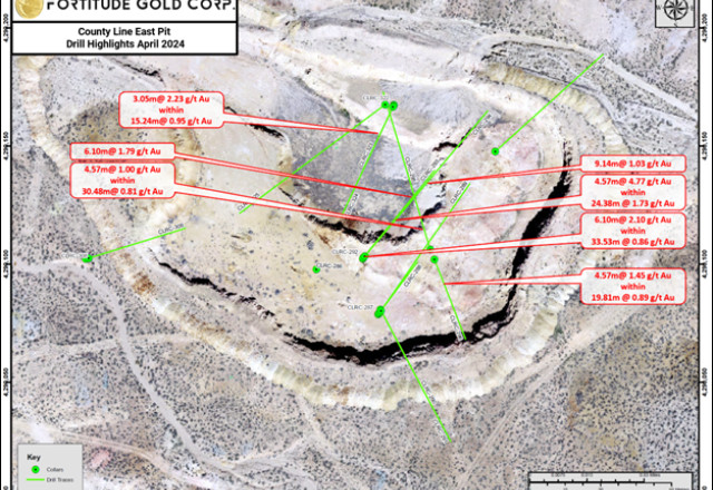 COLORADO SPRINGS, CO, April 22, 2024 (Newswire.com) - Fortitude Gold Corp. (OTCQB:FTCO) (the "Company") announced an expansion of its County Line East Pit high-grade gold feeder zone with multiple oxide gold drill intercepts at and near surface. Intercepts include 4.57 meters grading 4.77 grams per tonne (g/t) gold within 24.38 meters grading 1.73 g/t gold, 6.10 meters grading 2.10 g/t gold within 33.53 meters grading 0.86 g/t gold, and 6.10 meters grading 1.79 g/t gold. Fortitude Gold is a gold producer, developer, and explorer with operations in Nevada, U.S.A. offering investors exposure to both gold production and dividend yield.