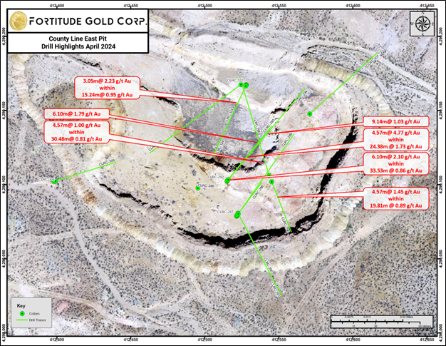 "This latest drill program confirms and expands upon a high-grade gold feeder zone within the East Pit," stated Mr. Allan Turner, Vice President of Exploration for Fortitude Gold. "We plan to continue adding gold ounces to County Line and are excited to drill untested additional targets peripheral to each pit."