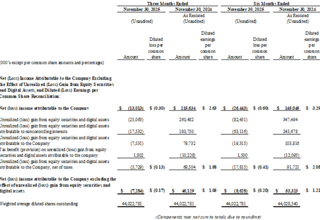 Net loss attributable to the Company excluding the effect of unrealized gain or loss from equity securities and digital assets net of taxes for the three months ended November 30, 2025 was $7.3 million ($0.17 per diluted share) compared to net income of $46.1 million ($1.05 per diluted share) for the three months ended November 30, 2024 (as restated). The six-month figures, as of the same end dates, are a net loss of $8.6 million ($0.20 per diluted share) in 2025 compared to net income of $53.3 million ($1.21 per diluted share) in 2024 (as restated).