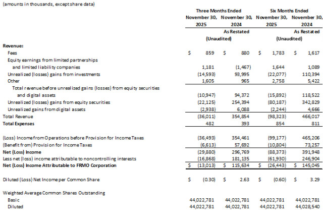 For the six months ended November 30, 2025, FRMO's net loss attributable to the Company was $26.4 million ($0.60 per diluted share), compared to net income of $145.0 million ($3.29 per diluted share) a year earlier.
