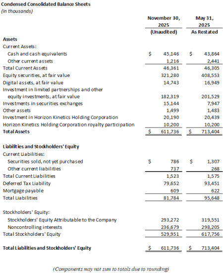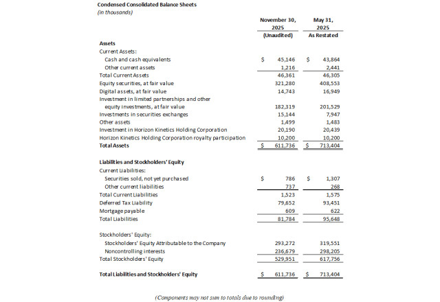 Current assets, comprised primarily of cash and cash equivalents, amounted to $46.4 million as of November 30, 2025, and $46.3 million as of May 31, 2025. Total liabilities were $81.8 million as of November 30, 2025, and $95.6 million as of May 31, 2025 (as restated), comprised primarily of deferred taxes and securities sold, not yet purchased.