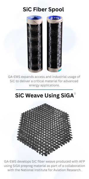 GA-EMS is executing two programs funded by the Advanced Materials and Manufacturing Technologies Office (AMMTO) of the DOE. Recent demonstrations include a SiC fiber process that is compatible with continuous production, which can reduce the production cost of domestic SiC fiber by 60%, as well as the utilization of automated fiber placement (AFP) to form complex SiC ceramic matrix composite structures. Together with a hybrid densification process, the team fabricated dense, high-purity SiC/SiC composites 70% faster and with 80% less energy than traditional chemical vapor infiltration.