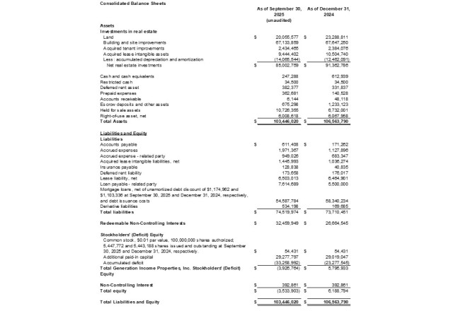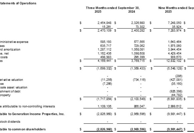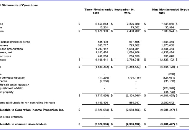 Tampa FL, November 17, 2025 (Newswire.com) - Generation Income Properties, Inc. (NASDAQ:GIPR) ("GIPR" or the "Company") today announced its three-month financial and operating results for the period ended September 30, 2025.