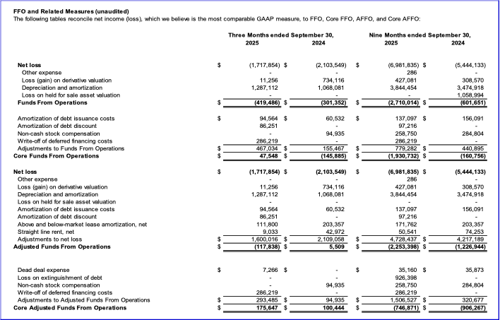 We compute FFO in accordance with the definition adopted by the Board of Governors of the National Association of Real Estate Investment Trusts ("NAREIT"). NAREIT defines FFO as GAAP net income or loss adjusted to exclude extraordinary items (as defined by GAAP), net gains from sales of depreciable real estate assets, impairment write-downs associated with depreciable real estate assets, and real estate related depreciation and amortization, including the pro rata share of such adjustments of unconsolidated subsidiaries. We then adjust FFO for non-cash revenues and expenses such as amortization of deferred financing costs, above and below market lease intangible amortization, straight line rent adjustment where the Company is both the lessor and lessee, and non-cash stock compensation to calculate Core AFFO.
