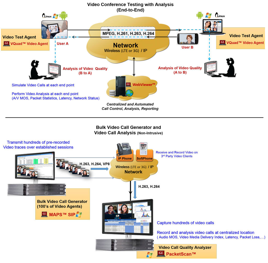 GL's VQuad™ with VAC solution supports end-to-end Video Conference testing between any two VAC agents. Agents can be Linux, Windows or Android devices. GL's MAPS™ SIP provides a means for Bulk Video Call generation, simulating many Video Calls from a single MAPS™ SIP system. As part of this solution, GL's PacketScan™ can provide real-time Video Call Analysis of the video generated over the SIP call using a non-intrusive connection to the network.