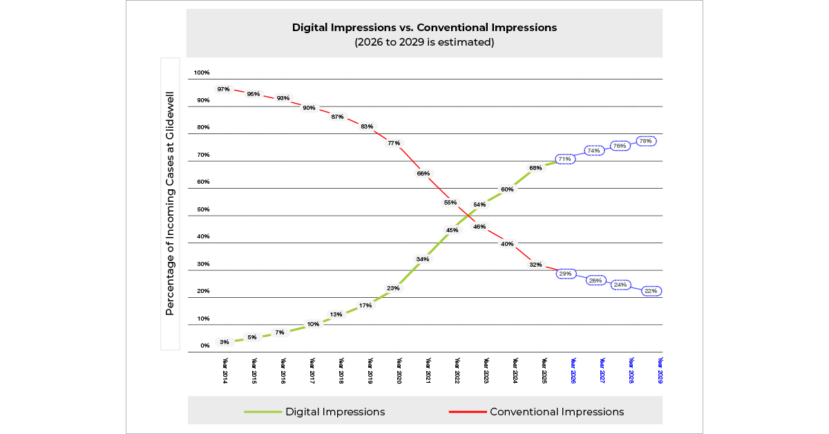 Comprehensive Glidewell data also projects digital impressions reaching 71% in 2026 and 78% by 2029, reflecting a steady shift away from conventional analog workflows.