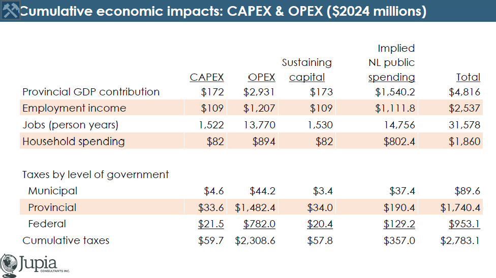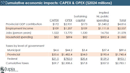 The Report provides a detailed economic impact model that considers direct and indirect as well as induced economic impacts within the province and across the country. The Project represents one of the largest private sector investments in recent history in southwestern Newfoundland. The following table shows the combined cumulative economic impacts of the capital and operational expenditure phases, along with an estimate of the economic impacts of spending provincial tax revenues on public services.