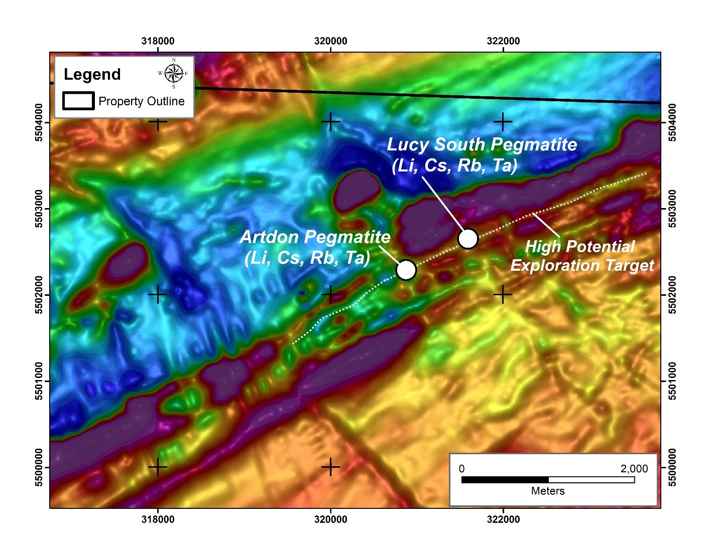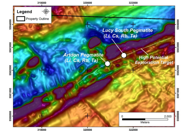 Figure 2: Drill-defined locations of the Lucy South and Artdon LCT pegmatites overlain on a total field magnetic image based on the Company's fall 2024 fixed-wing magnetic and radiometric survey. The dotted white line identifies the current regional exploration target that follows an extensive magnetic low anomaly that hosts both the Artdon and Lucy South pegmatites. The latter two areas may be part of a single LCT pegmatite - but are separated by several hundred metres where no drilling has yet occurred.