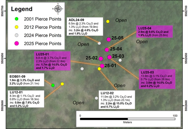 3.01 metres with 14.0% Cs2O and 0.50% Rb2O (LU25-03; from 31.5 metres) including 0.61 metres with 24.2% Cs2O and 0.50 metres with 24.7% Cs2O