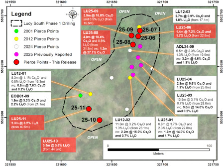 Highlights from the second batch of assays (holes 6-11) include 4.04 metres with 10.4% Cs2O and 0.76% Li2O (LU25-08; from 21.8 metres) and 3.45 metres at 16.8% Cs2O and 0.86% Li2O (LU25-09; from 15.6 metres).The highest-grade intercept to date in the program was a sub-interval of 1.24m grading 27.1% Cs2O in drill hole LU25-08.