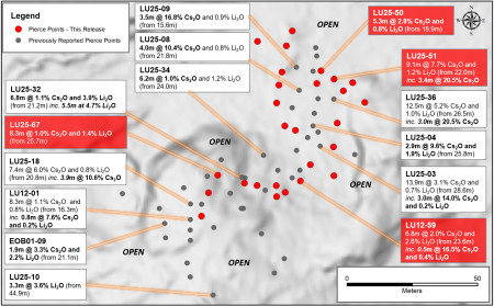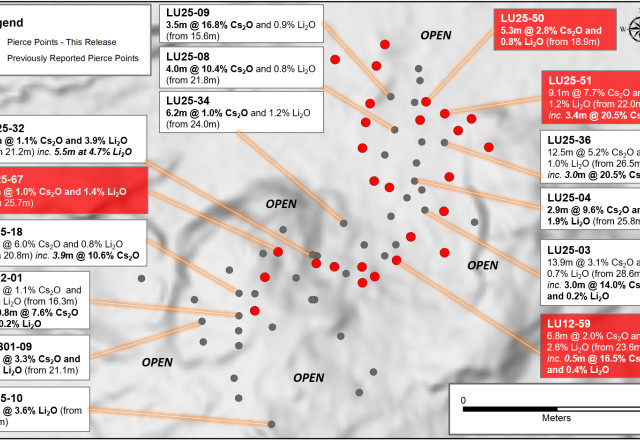 The best cesium intercept drilled at the Property to date was returned in hole LU25-51 of 3.35 m grading 20.45% Cs2O including 2.35 m with 28.4% Cs2O. Other highlights from the current batch of reported holes are shown in Table 1.