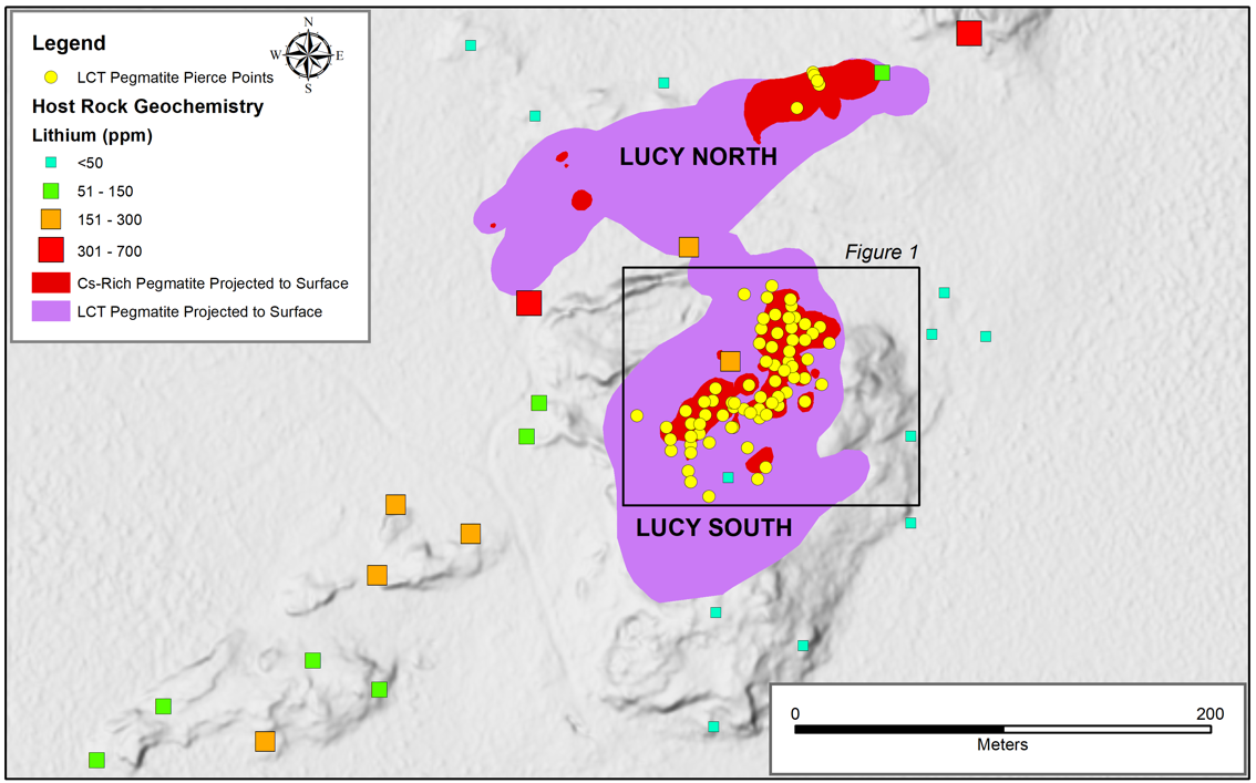 The Lucy South core zone remains open in multiple directions. There are indications that the overall extent of the host LCT pegmatite could be larger than the immediate detailed drilling area based on magnetic survey data, historical drill hole information and bedrock and vegetation geochemical survey results.