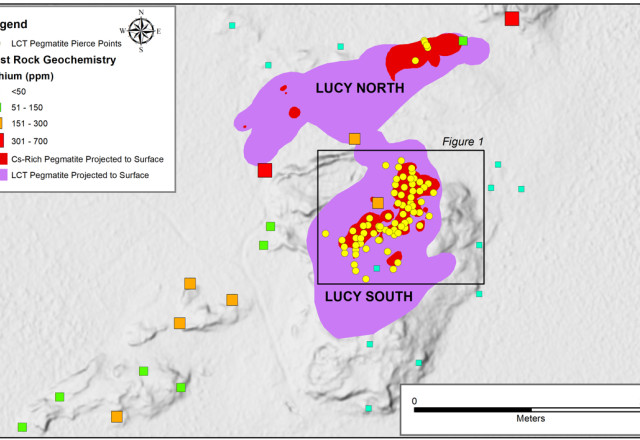 A total of 28 holes are reported in this release such that all 67 holes (3,035 metres) have now been reported from the Phase 1 cesium-focused drill program at Lucy South. Significant results include both cesium-rich and lithium-rich intersections hosted by the highly fractionated core zone of the host Lucy South pegmatite. All of the reported drillholes in the program have intercepted Lucy South at no greater than 50m vertical depth. The majority of cesium intercepts have occurred at a down hole depth of less than 30 meters.