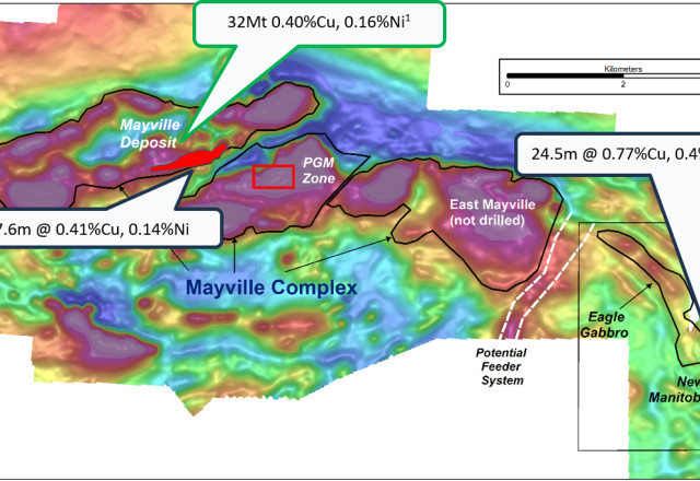 A large airborne magnetic-EM survey is planned for the highly prospective eastern part of the Mayville-Eagle complex, including the Eagle gabbro target area.
