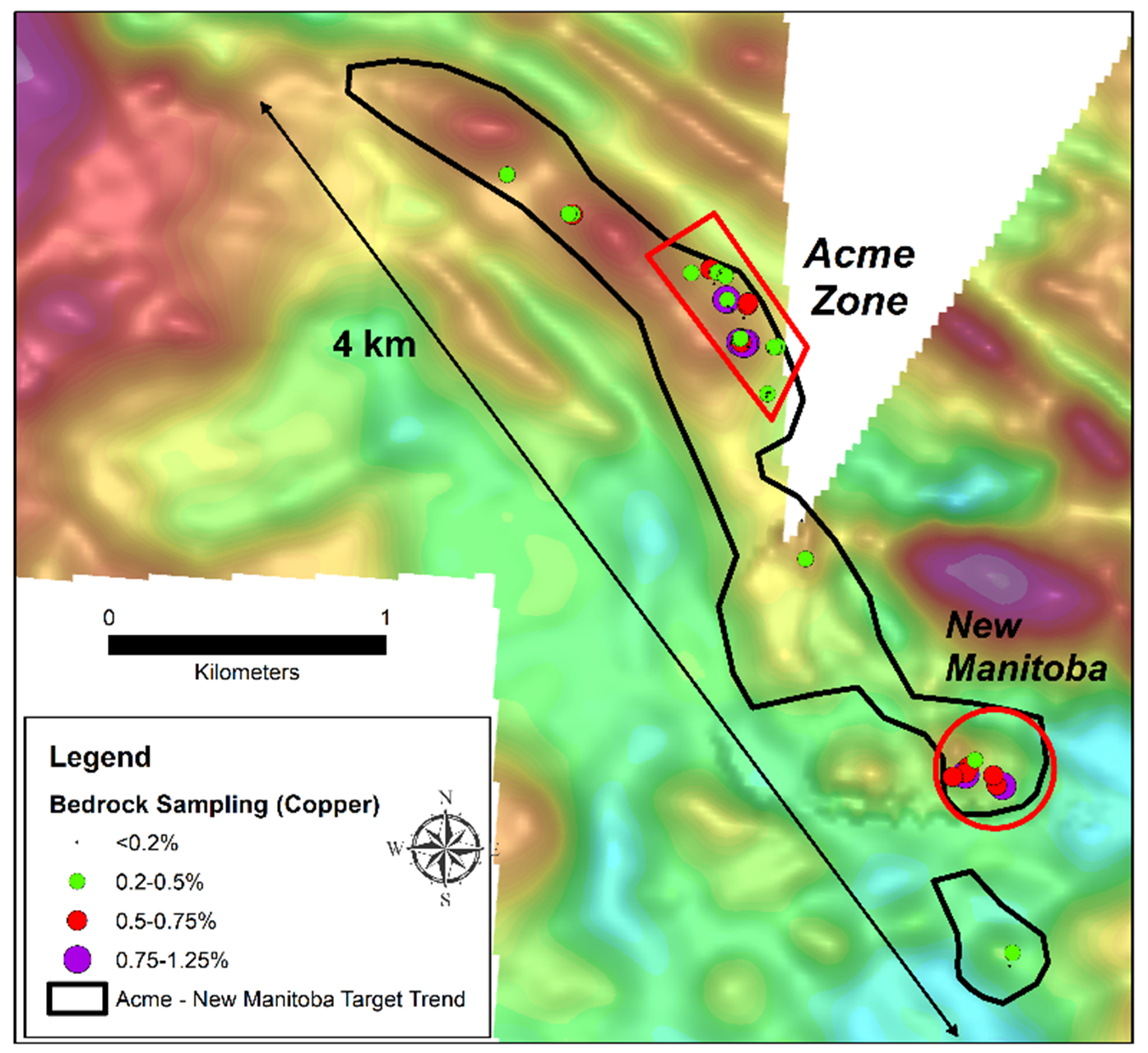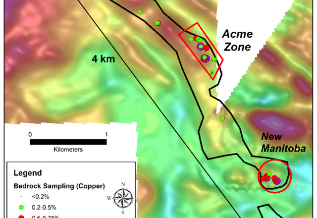 Figure 4. Outline of interpreted extent of the Eagle gabbro (black outline) - host to the New Manitoba deposit and the Acme Zone, on colour shaded total magnetic intensity background image. Coloured circles are copper grades from initial 2024 grab samples. New Manitoba area was drilled in the 1950's with follow up in the 1970's and 2009 (see Footnote 2).