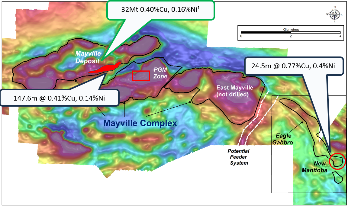 Figure 3. Mayville-Eagle project area on colour shaded total magnetic intensity background image. The most recent drilling results from the area are shown (Mayville deposit - Grid Metals, 2023); New Manitoba - Clifton Star Resources, 2009).