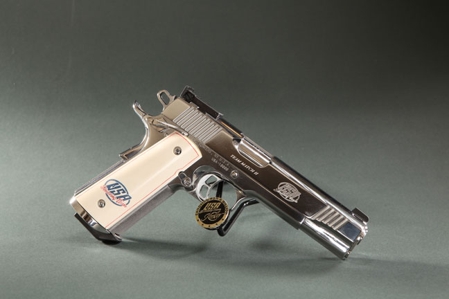The unique and highly-customized Team Match II .45 ACP was presented to the USA Shooting Team by Kimber owner and CEO Leslie Edelman at the 2012 SHOT Show. A one-of-a-kind pistol, it bears serial number "USA-10000" to commemorate sales of 10,000 Team Match II pistols. In addition to the standard features of the Team Match II, this spectacular pistol has a mirror-polish finish, scrimshawed ivory grips with the USA Shooting Team logo crafted by Dan Chesiak and rests in a walnut and glass presentation case.