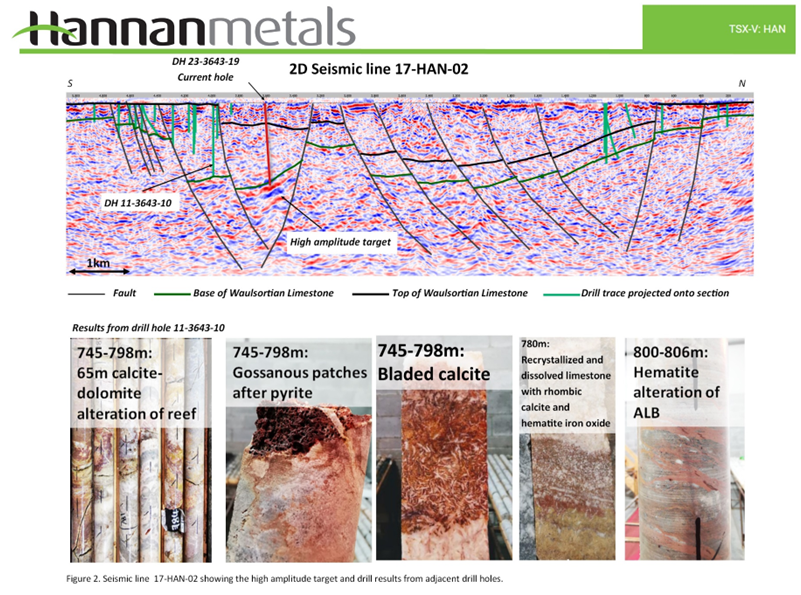 - The seismic reflector was identified in line 17-HAN-02, acquired by Hannan in 2018. The target extends over 1 km strike with the highest amplitudes focused in a 400 m wide zone at 700 m depth (Figure 2).