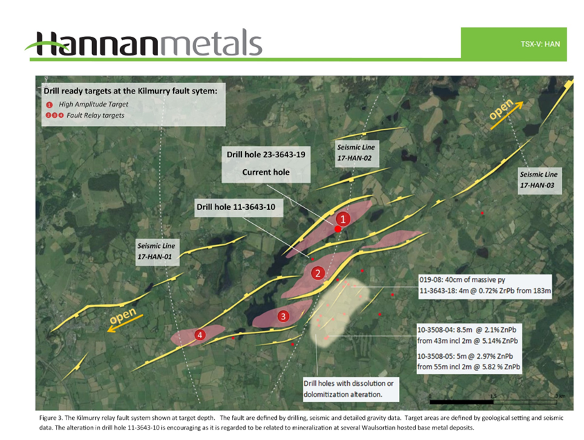 Historic work at Kilmurry by Lundin Mining, predating Hannan's exploration, focused on the footwall of the fault system prior to the context that the seismic surveying provided. The results strongly suggested the presence of an active mineralizing system in the area. This is exemplified by the dissolution breccias in various drill holes and low-grade base metal mineralization up to 2 m @ 5.8 % Zn+Pb. The seismic survey suggested the best part of the fault system (the hanging wall), was poorly drill tested, with only one drill hole reaching the target depth (DH 11-3643-10) after an extension by Hannan in 2018. The drill hole intersected 0.3 m @ 56.5% Zn+Pb at 166m depth high in a hanging wall of a fault. This was followed by multiphase calcite-dolomite breccias with gossanous patches after pyrite between 754-819m depth. The drill hole also intersected intense hydrothermal hematite alteration over 4 m width in the footwall of the potentially mineralized unit. The hydrothermal hematite alteration is highly significant as it lies proximal to mineralization at Irish-style deposits such as Lisheen, Tynagh and Silvermines and can be considered a near-miss indicator.