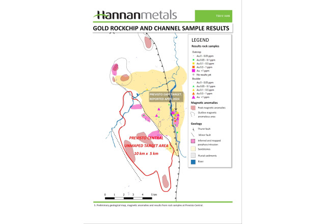 Michael Hudson, CEO, states: "The Previsto Central discovery, at this pre-drilling stage, appears to be an extremely large porphyry-epithermal system in the making. What we are initially seeing in outcrop at Previsto Central is just a glimpse of what maybe hidden under thin soil cover and only a very small portion of the target area of about 10 km by 5 km area has been prospected to date. Our focus during the dry season will be to continue de-risk and move Previsto Central forward to drill permitting as soon as possible."