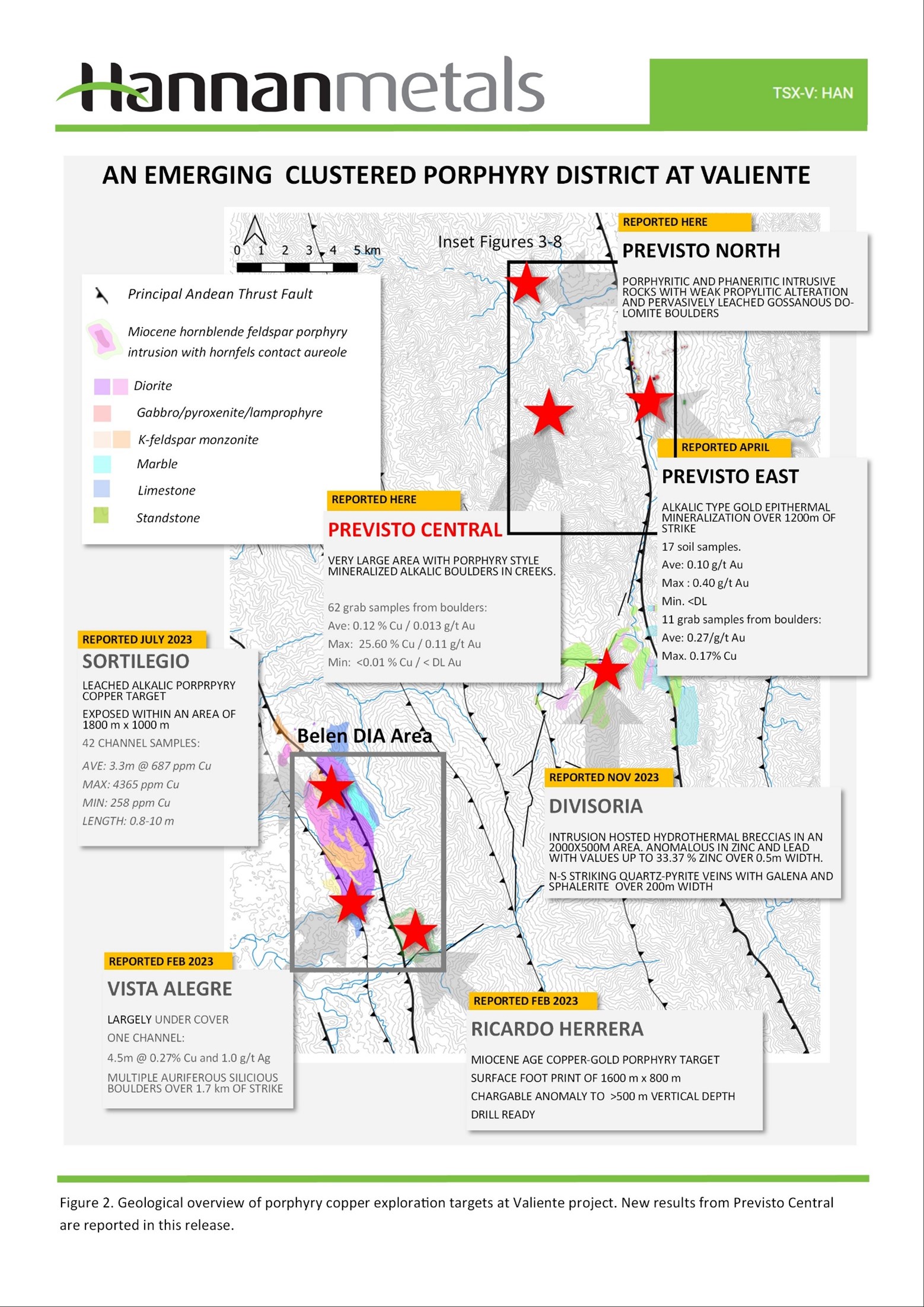 During 2021 Hannan staked and still holds 1,002 km2 of 100% owned mining concessions at Valiente covering unexplored terrain for potential mineralized porphyry targets in central eastern Peru. Early surface prospecting discovered two outcropping copper-gold porphyry targets and one epithermal target at Belen (see Press Release Feb 16, 2023) that is now being drill permitted (Figures 1 and 2). Porphyry discoveries quickly followed at Serrano Norte, Serrano and Pucacunga. The focus more recently has been on Previsto. At Previsto and Belen, a district-scale porphyry cluster within an area of 25 km by 10 km, with eight porphyry and/or epithermal targets now identified in more detail with up to 10 earlier stage targets awaiting further work.