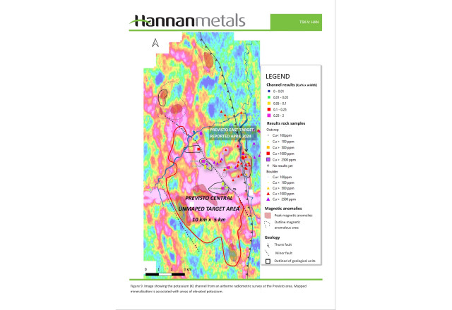 - Scale: The new discovery coincides with a 10 km x 5 km large airborne magnetic and radiometric potassic anomaly (Figures 8 and 9). Mapped mineralization at Previsto is associated with areas of elevated magnetic and potassium. The footprint of the combined magnetic and potassic anomaly is considered significant on a global scale.