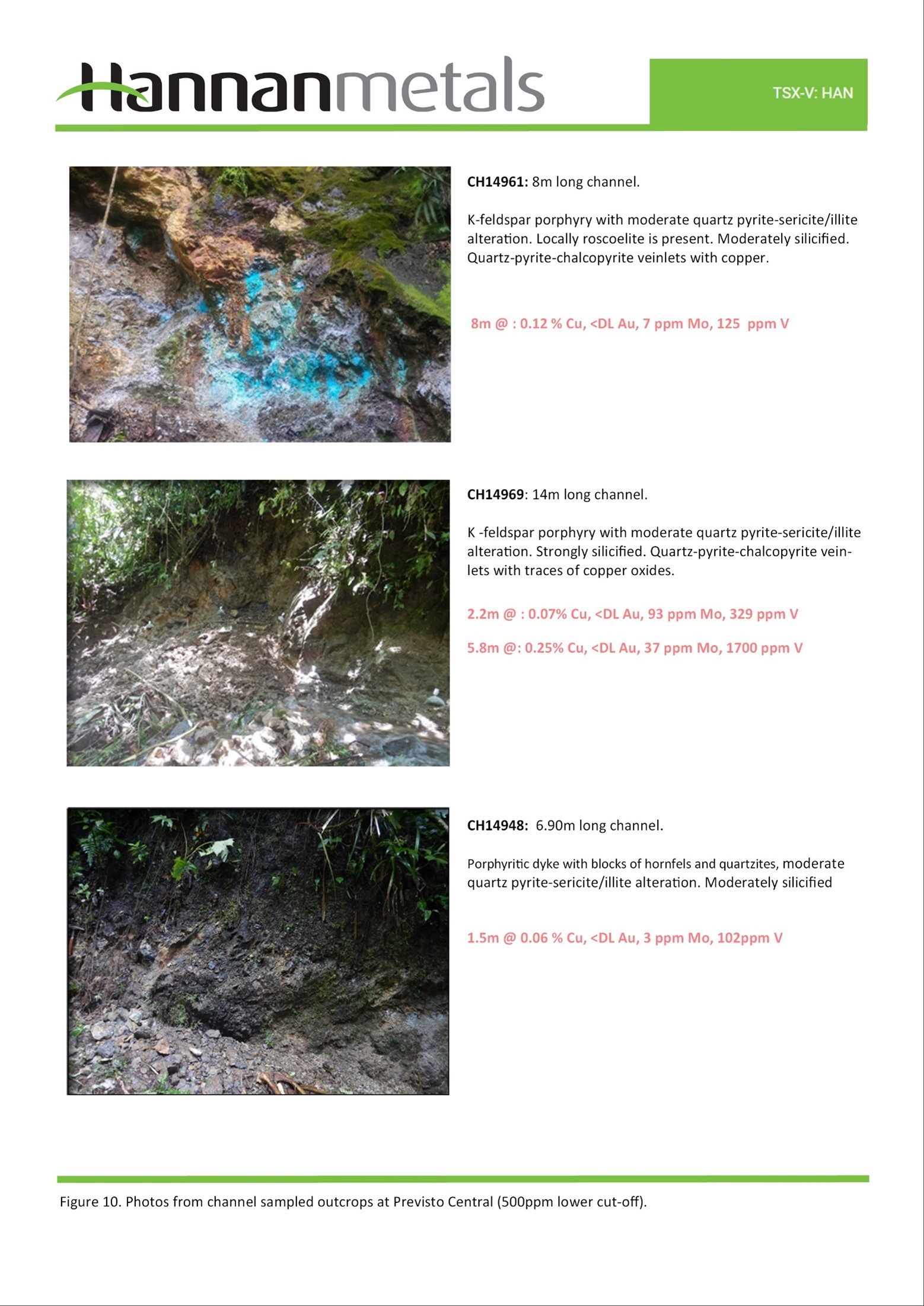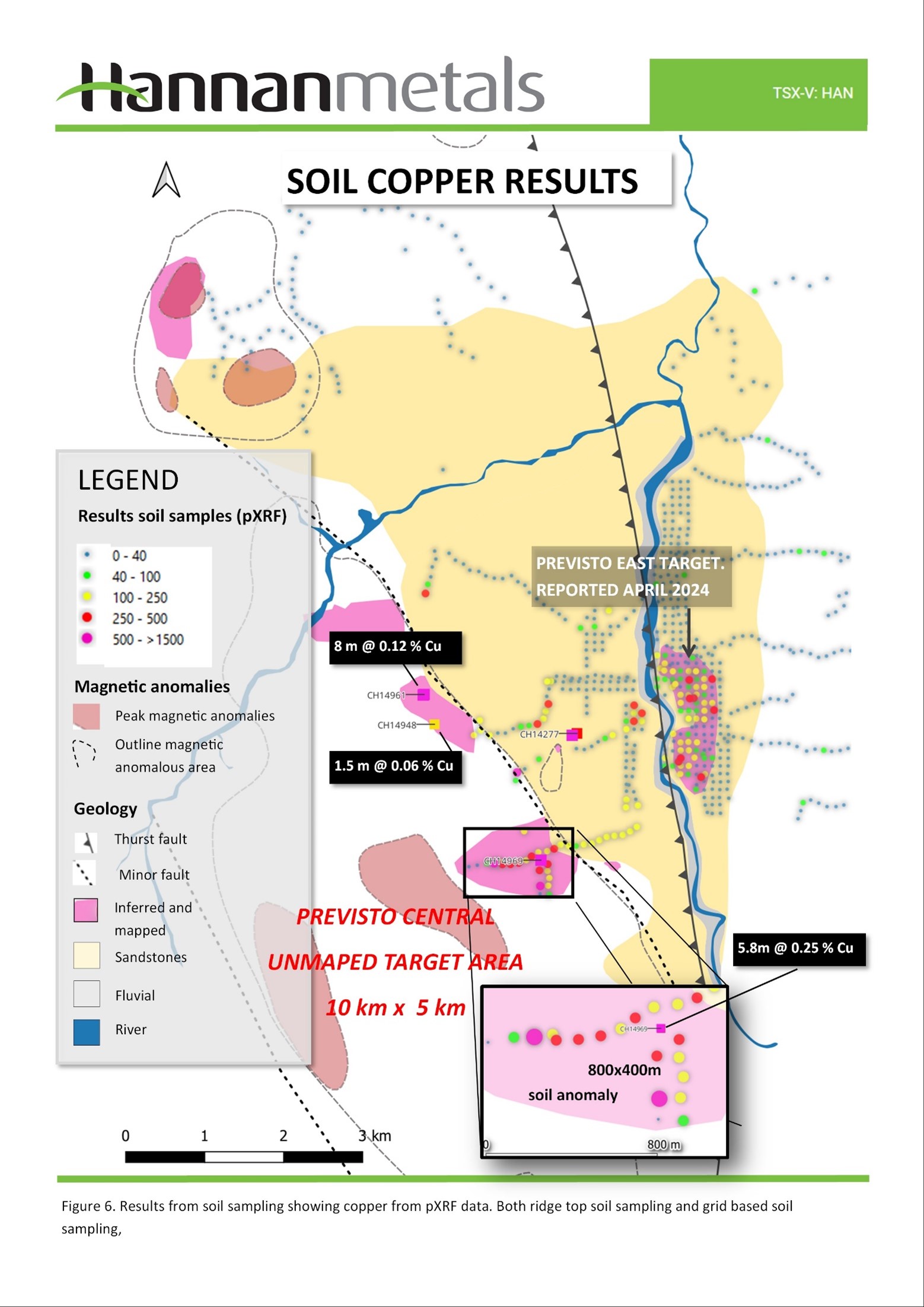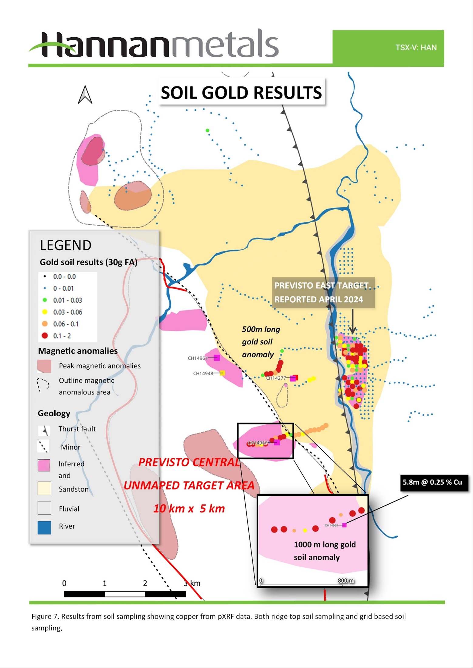 Previsto Central exhibits highly anomalous soil geochemical anomalies over 1,000 m, with anomalous rock chip samples and numerous windows of exposed copper and gold mineralization within a 4 km by 1 km area (Figures 3 to 7).