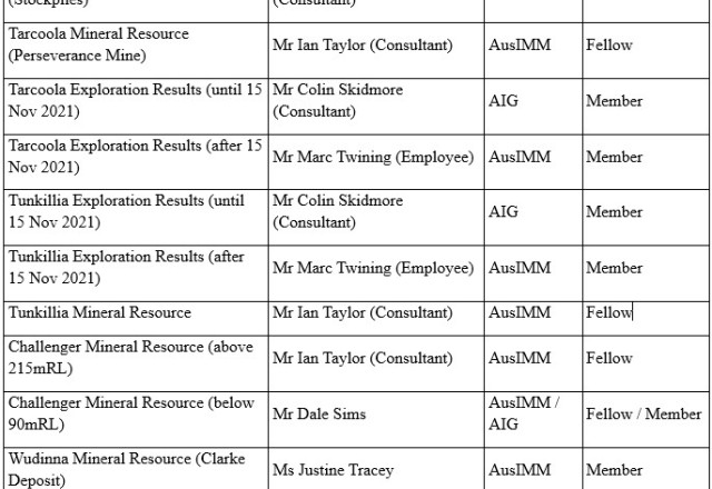 The information in this announcement that relates to the historic Exploration Results and Mineral Resources as listed in the table below is based on, and fairly represents, information and supporting documentation prepared by the Competent Person whose name appears in the same row, who is an employee of or independent consultant to the Company and is a Member or Fellow of the Australasian Institute of Mining and Metallurgy (AusIMM ), Australian Institute of Geoscientists (AIG) or a Recognised Professional Organisation (RPO). Each person named in the table below has sufficient experience which is relevant to the style of mineralisation and types of deposits under consideration and to the activity which he has undertaken to quality as a Competent Person as defined in the JORC Code 2012 (JORC).