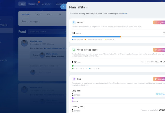 Unexpected system limits can slow down a business. Emails might not reach clients, files could fail to upload, or storage could run out at the worst possible moment. These disruptions cost time, focus, and momentum. Bitrix24's updated Subscription section gives administrators an instant view of storage, email usage, user access, and plan details, so potential issues can be spotted and handled before they affect daily operations.