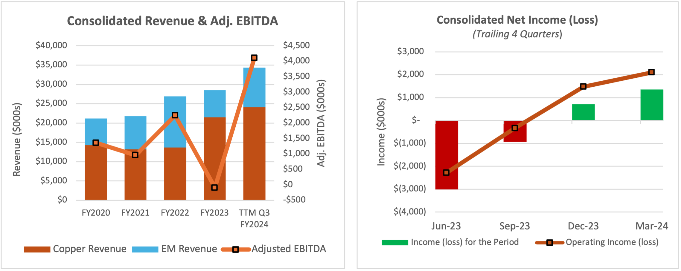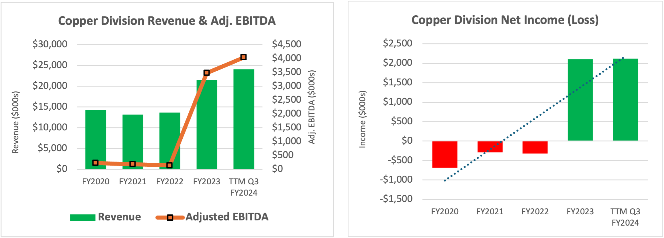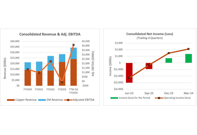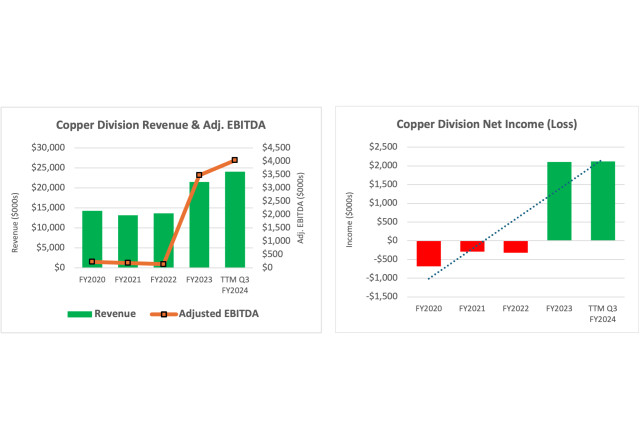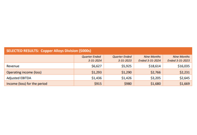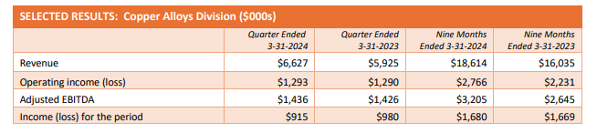 - Copper Alloys division sales of $6.6 million were higher by 11.9% quarter over quarter ("Q/Q"), and Engineered Materials division sales were higher by 97.5% Q/Q. On a TTM basis, Copper Alloys sales of $24 million set a record for a 12-month period for the division.