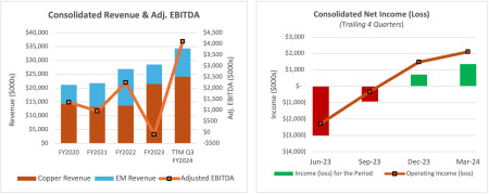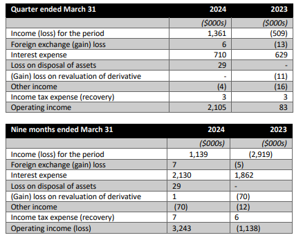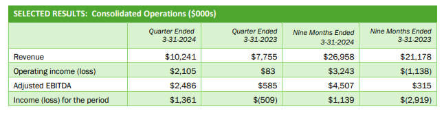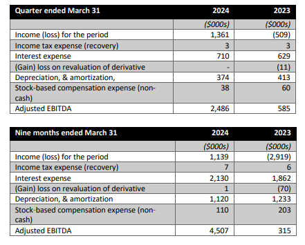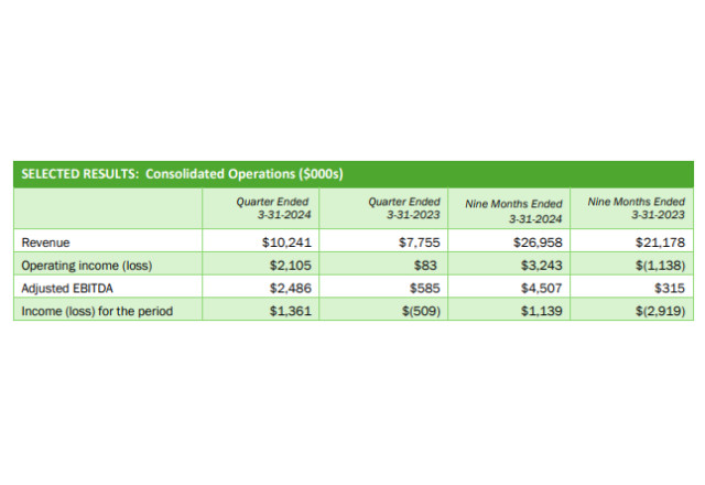 - Net income of $1.36 million, or $0.01 per share, in the quarter on sales of $10.2 million - a new quarterly record. Sales of $34.3 million on a trailing 12-month ("TTM") basis and sales of $27.0 million in the nine-month period ended March 31, 2024, also were the highest ever recorded.