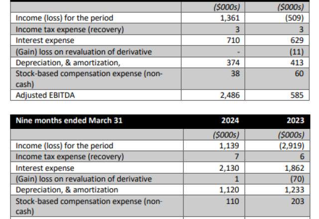 Adjusted EBITDA represents the Company's income (loss) for the period, and year-to-date, before interest, income taxes, depreciation, amortization, and share-based compensation. A reconciliation of the quarter and year-to-date loss to Adjusted EBITDA follows: