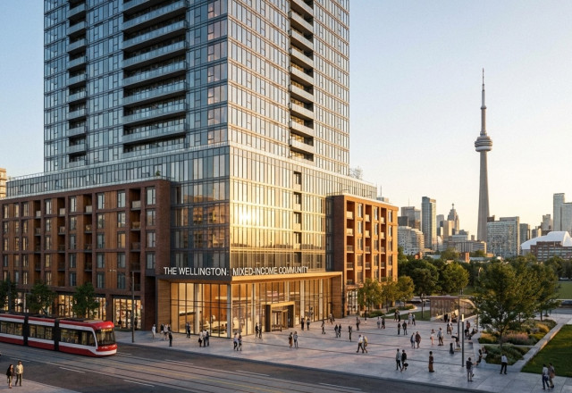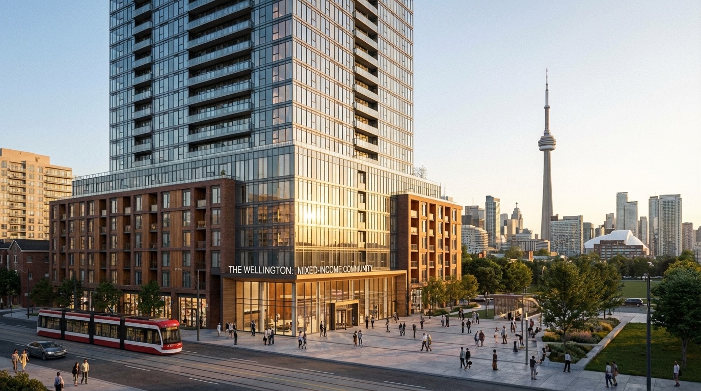 A modern mixed-income residential tower integrated into Toronto's urban fabric.