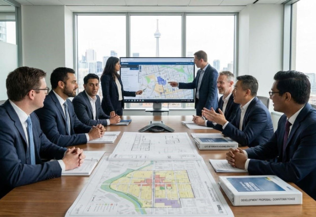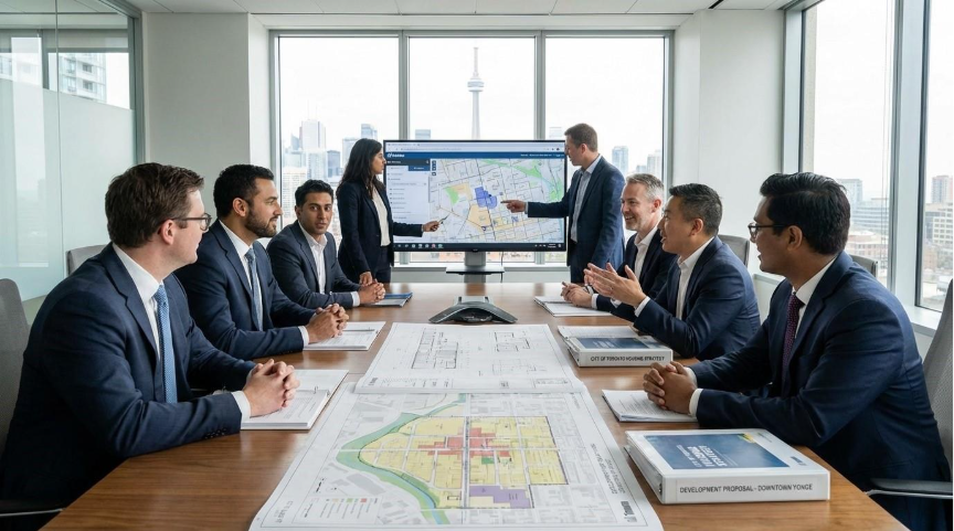 City planners and developers collaborate on affordable housing policy in a Toronto boardroom.