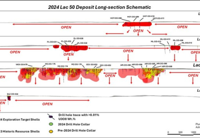 At the Rib Discovery - located ~30 km southwest of the Lac 50 Deposit, situated along the western margin of the Angikuni Basin - early exploration programs were conducted by Noranda Exploration Company ("Noranda"). Between 1977 and 1979 Noranda completed 30 diamond drill holes at the Rib Discovery intersecting Athabasca Basin style unconformity alteration, structure, and lithologies associated with shallow (25 m depth) uranium mineralization with grades of up to 5.6% U3O8 hosted within graphitic mylonites. These historic drill results demonstrate that the Angikuni Basin has the potential to host Athabasca Basin style basement and unconformity type uranium mineralization. Coupling of the historic drill results with the 2024 MMT survey results and the recent structural interpretation completed by SRK, the scale and potential of the WMT to host multiple additional unconformity and basement type uranium mineralized zones along the 31 km trend is high. Importantly, as was typical of 1970 - 1980's Athabasca Basin exploration the maximum depth of drilling at Rib is ~100 m, ending in what is now considered to be prospective alteration and lithologies. The 2024 MMT survey demonstrates that the prospective conductive horizon along the WMT extends from surface to depths of more than 1 km, within and along the margins of the Angikuni Basin.