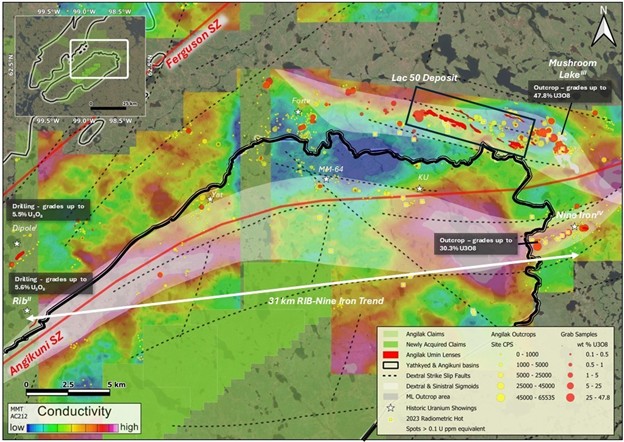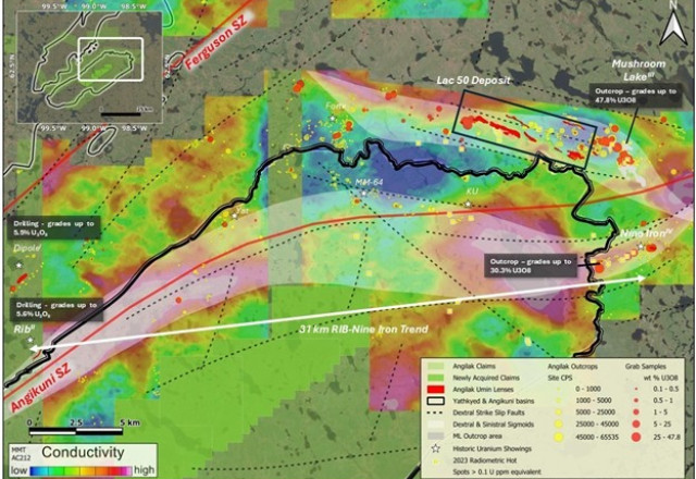 Results from the MMT survey confirm the depth extent of the prospective conductive horizons that host uranium mineralization at the Lac 50 Deposit and Nine Iron Discovery (Figure 1). At the Lac 50 Deposit the survey indicates that the prospective conductive horizons extend to approximately 1 km depth, while at Nine Iron Discovery the prospective horizons extend to approximately 800 m depth. At both areas the results demonstrate the potential for mineralization to extend well beyond the current envelops of mineralization. Additionally, along the western margin of the Angikuni Basin a 31 km conductive trend - significantly more conductive than Lac 50 and Nine Iron - has been identified. During the late 1970's several rounds of exploration took place along the Western Margin Trend ("WMT"), inclusive of diamond drilling, trenching and soil sampling, which resulted in the discovery of numerous uranium showings, including Rib and Yat.