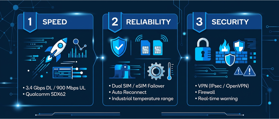 Blazing 5G Speeds: Leveraging the Qualcomm SDX62 platform, the router achieves 3.4 Gbps downlink and 900 Mbps uplink speeds, certified across Verizon, AT&T, and T-Mobile networks. This ensures seamless HD video streaming, real-time telemetry, and massive IoT data transmission.