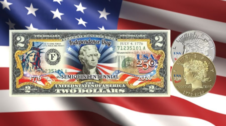 Several Proud Patriots bundles include what the company describes as a genuine U.S. legal tender $2 bill enhanced with commemorative colorization or imagery celebrating the 250th Anniversary.